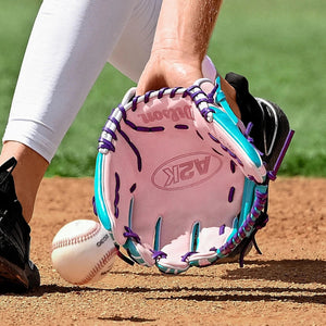 An 11.5” infield glove with Pink & Teal Pro Stock® Select leather for work at second base, third base or shortstop.