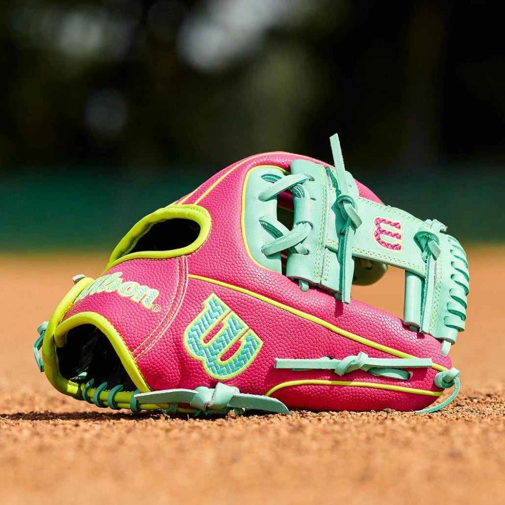 Anything but routine, the Spring 2026 A2000® DP15SS is optimized with Pedroia Fit Technology for players with smaller hands to make every play look easy at second base, third base or shortstop. The narrower wrist opening and shorter finger stalls, designed with longtime Boston infielder Dustin Pedroia, help young players improve their command of the glove. Take advantage of the 11.5” reach to secure grounders up the middle or hot shots down the line in the Seafoam Pro Stock® leather palm and H-Web. Optic Yellow accents add some flash while Flamingo Pink SuperSkin™ across the back keeps the glove lightweight and ready for the next rep.