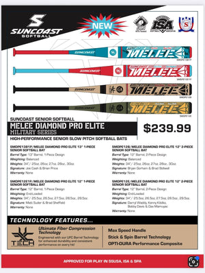 2026 Suncoast Melee Diamond Pro Elite Military Series Balanced 1-Piece Senior Slowpitch Bat: SMDPE13B1P