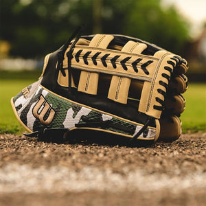 The Winter 2024 A2000® 1810, a 12.75” outfield glove with a modified wrist strap and wider pinky stall, creates a secure fit when worn with multiple fingers in the pinky for improved control. The A2000 1810’s Single Post Web extends for catches at the wall and channels the ball into the Blonde Pro Stock® leather palm, engineered for lasting performance and consistent feel. Camouflage Super SnakeSkin™ appears along the thumb wrist and pinky, helping outfielders catch batted balls by surprise.
