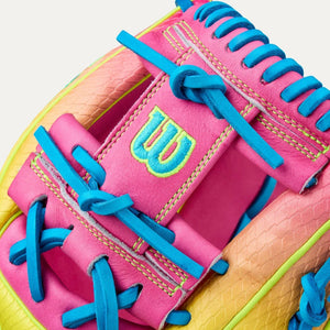 Make quick work of batted balls up the middle or screaming line drives at the hot corner with the Fall 2025 A2000® 1786SS, Wilson’s iconic infield baseball glove pattern featuring Pink Lemonade Gradient SuperSnakeSkin™ transitioning from Pink to Yellow to Blue across the back. The glove’s Pink Pro Stock® leather delivers lasting comfort and performance while the shallow pocket, H-Web and 11.5” reach make it easy to transfer the ball and throw to any base. The lightweight SuperSnakeSkin™ repels moisture from rain or wet grass to help second basemen, third basemen or shortstops range all over the infield.