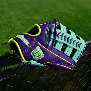 Cover the outfield grass from gap to gap with the Fall 2025 A2000® 1810SS, a 12.75” outfield baseball glove engineered for a secure fit, especially when worn with multiple fingers in the pinky stall. The glove’s modified wrist strap improves comfort and hugs the back of the hand while reaching for sinking line drives. Seafoam Pro Stock® leather across the palm and Single & Double Bar Web offers lasting comfort while keeping its shape on diving catches. Purple SuperSkin™ spans the back of the glove to repel moisture from rain or wet grass, keeping the glove lightweight so outfielders can make showstopping grabs.