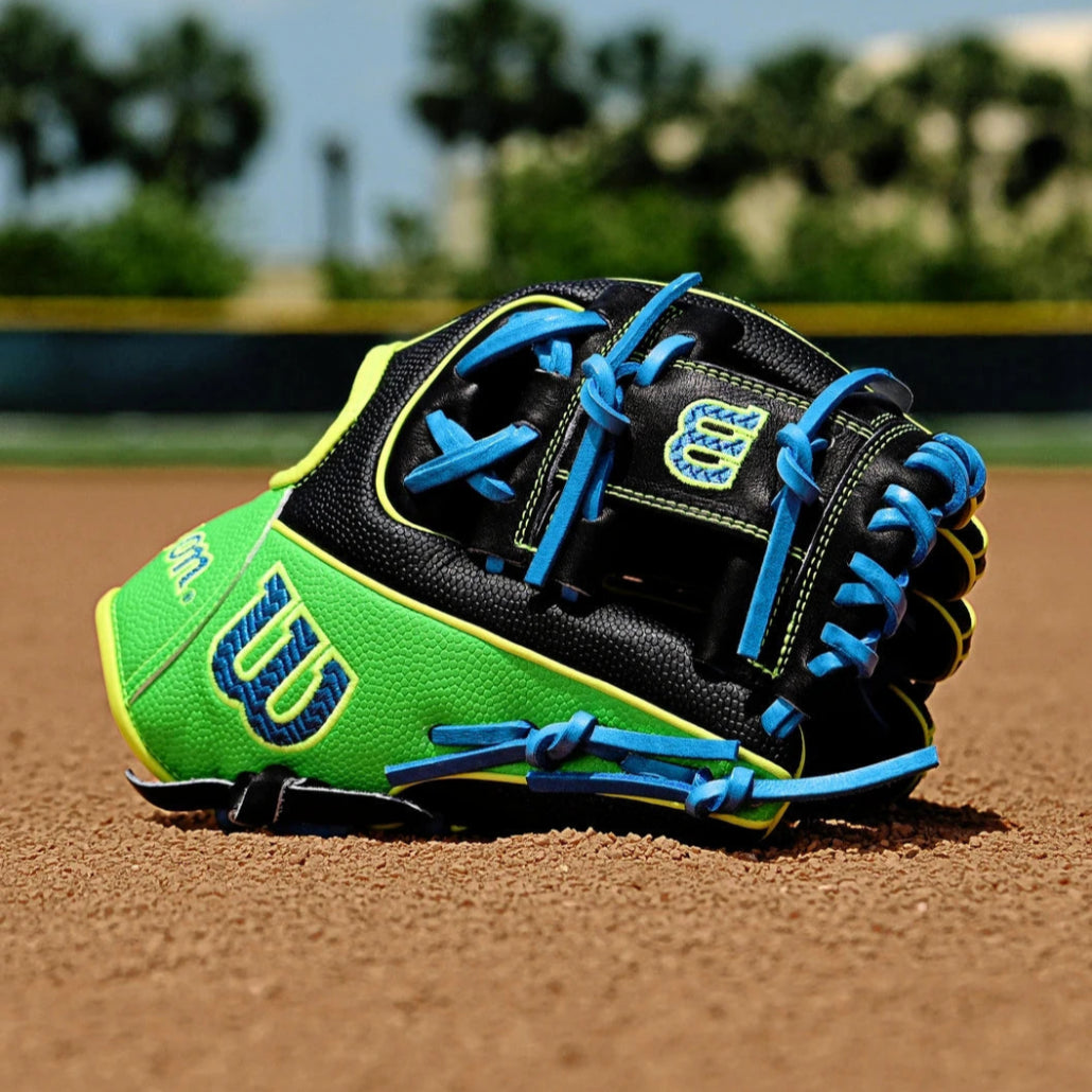 Easy agility on the infield. The A2000® PF88SS is optimized with Pedroia Fit technology – a narrower wrist opening and shorter finger stalls – to help players with smaller hands take more control of ground balls, line drives and pop flies on the infield dirt. Turn quick throws from second base, third base or shortstop with the glove’s shallow pocket, H-Web and smaller 11.25” design. Black Pro Stock® leather offers lasting comfort & performance while the Black and Neon Green SuperSkin™ across the back keeps the glove lightweight.