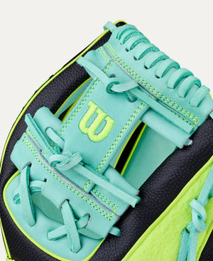 Dominate baseline to baseline with the 2025 Tennis A2000® 1786SS, an 11.5” infield glove with genuine Wilson tennis ball felt gracing the outside of the glove. Bringing the precision, finesse and flair of the court to the field, this 1786’s shallow pocket and classic H-Web enable lightning-fast reflexes and transfers on any ball hit your way. Seafoam Pro Stock® Leather and Black SuperSkin™ serve up a lightweight, fast feel with the enduring, consistent performance needed to stay in the game.