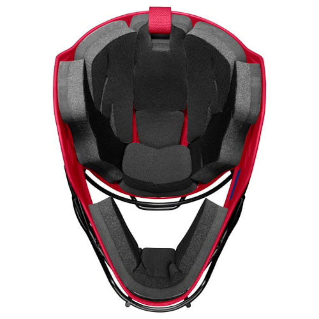 The helmet boasts a centered view port and high-impact steel mask, giving players premium visibility and protection from foul tips and wild pitches. The chest protector is designed to resist bunching or folding when crouched, so players stay fully shielded without sacrificing range of motion. Articulated leg guards are engineered with contour zones to flex naturally, offering ideal wrap and coverage throughout the catching motion.